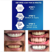 Нанесете еднаш дневно 30 минути Забележливи резултати ВЕДНАШ! Целосни резултати за 3-4 дена Напредната технологија 🫧Seal™, нелизгачки ленти остануваат поставени за да можете да зборувате и да пиете вода додека ги избелувате забите!